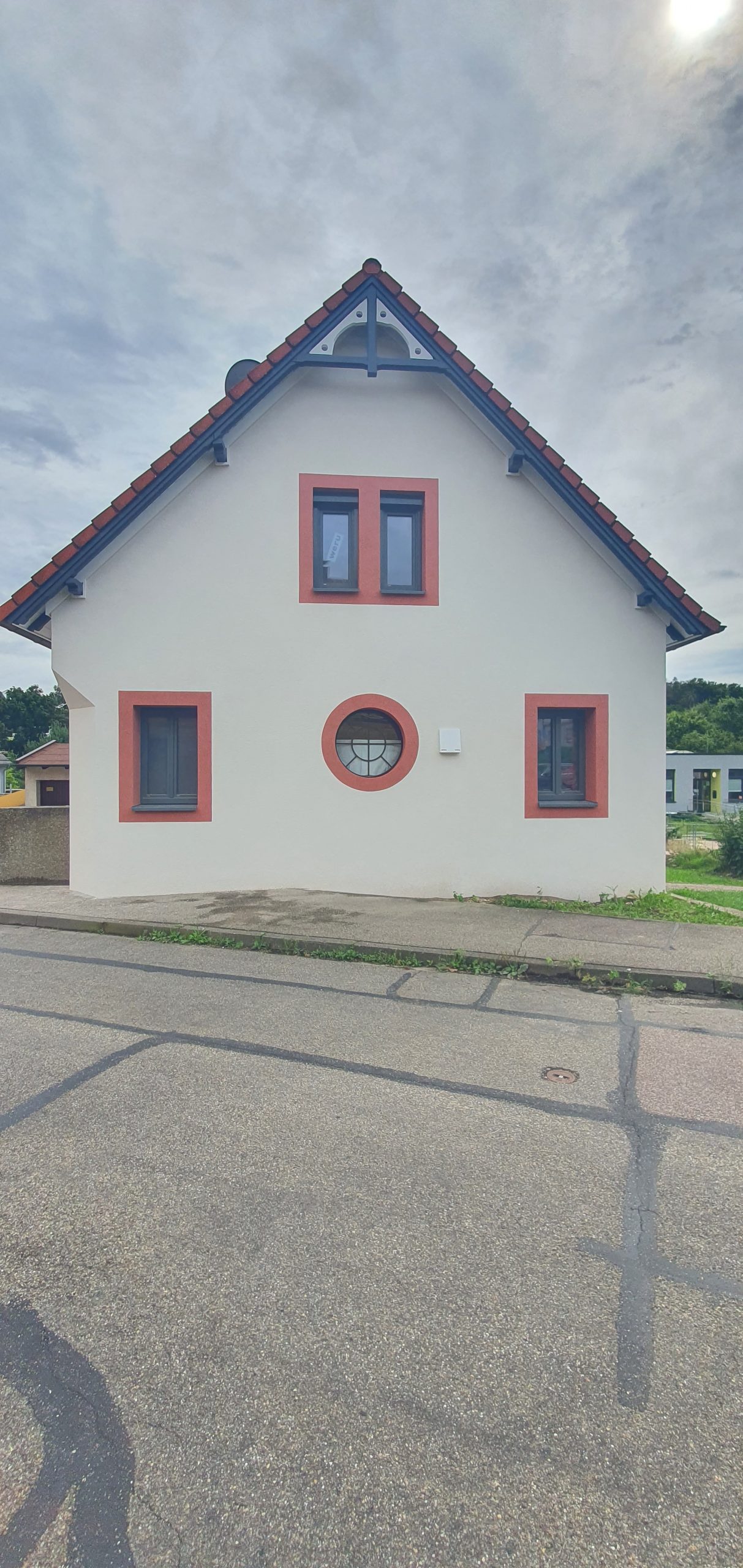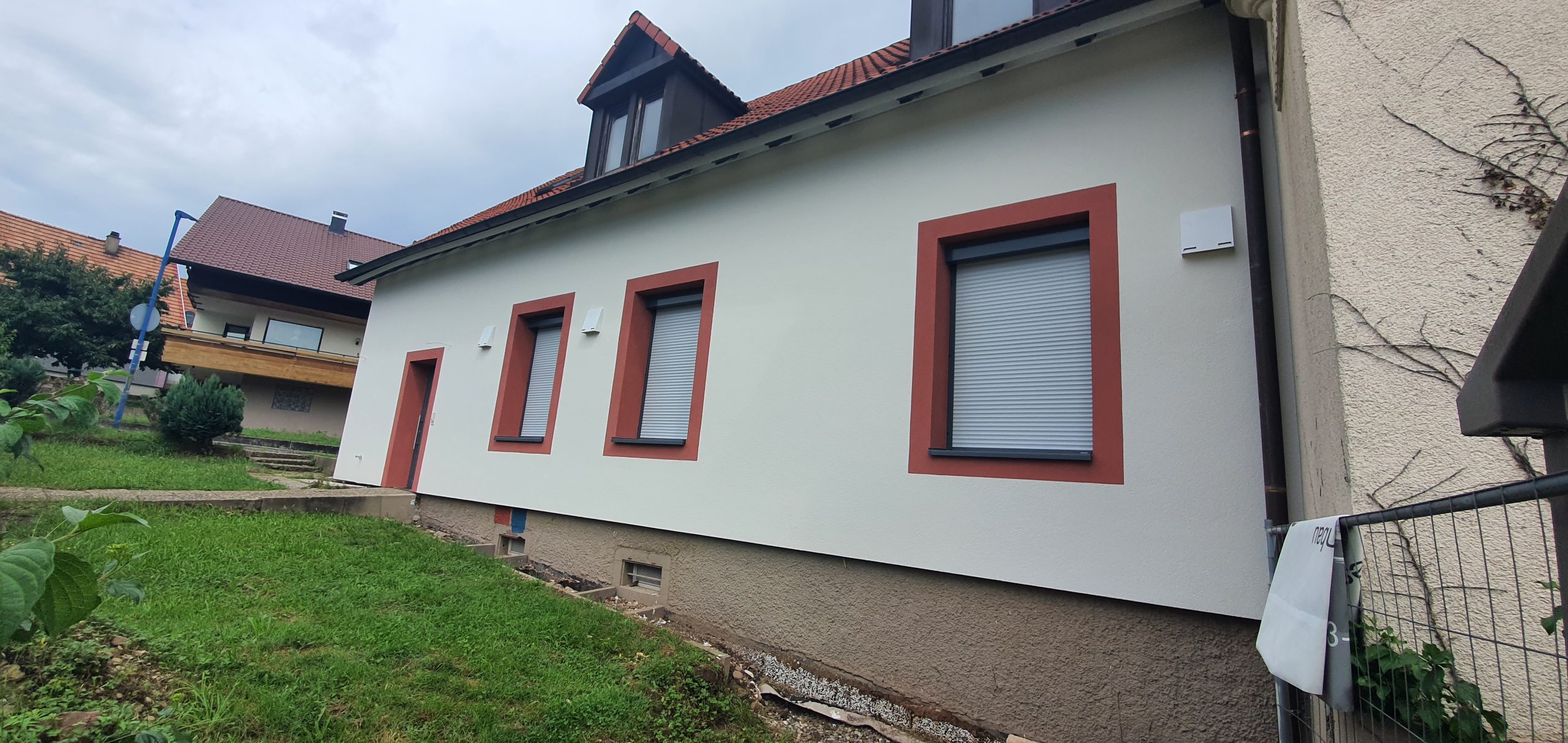 Im Außenbereich wurde die Fassade saniert und mit einer Wärmedämmung versehen. Die Fenstergewänder wurden beim Auftragen des Oberputzes in Anlehnung an den ursprünglichen Zustand lediglich mit Filzputz ausgeführt und farblich abgesetzt, um historische Details zu erhalten.