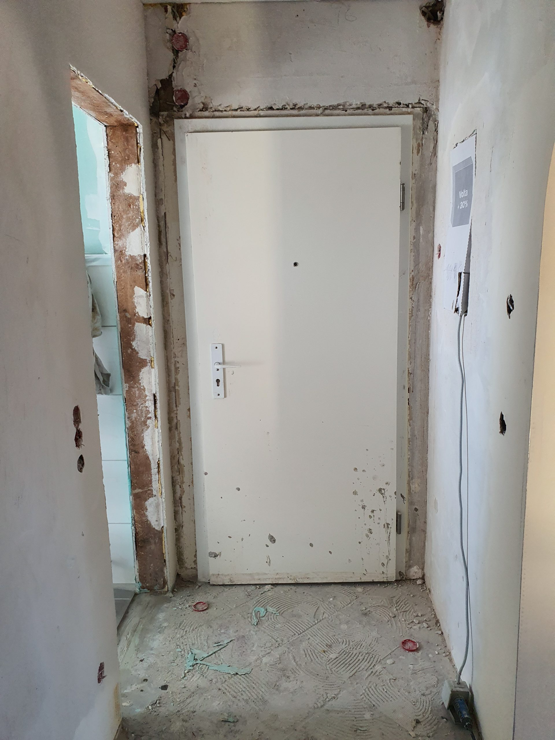 Die bestehende Holzeingangstüre wurde ausgebaut und durch eine neue Wohnungseingangstüre ersetzt, wodurch sowohl die Sicherheit als auch der Schallschutz und die optische Qualität verbessert wurden.