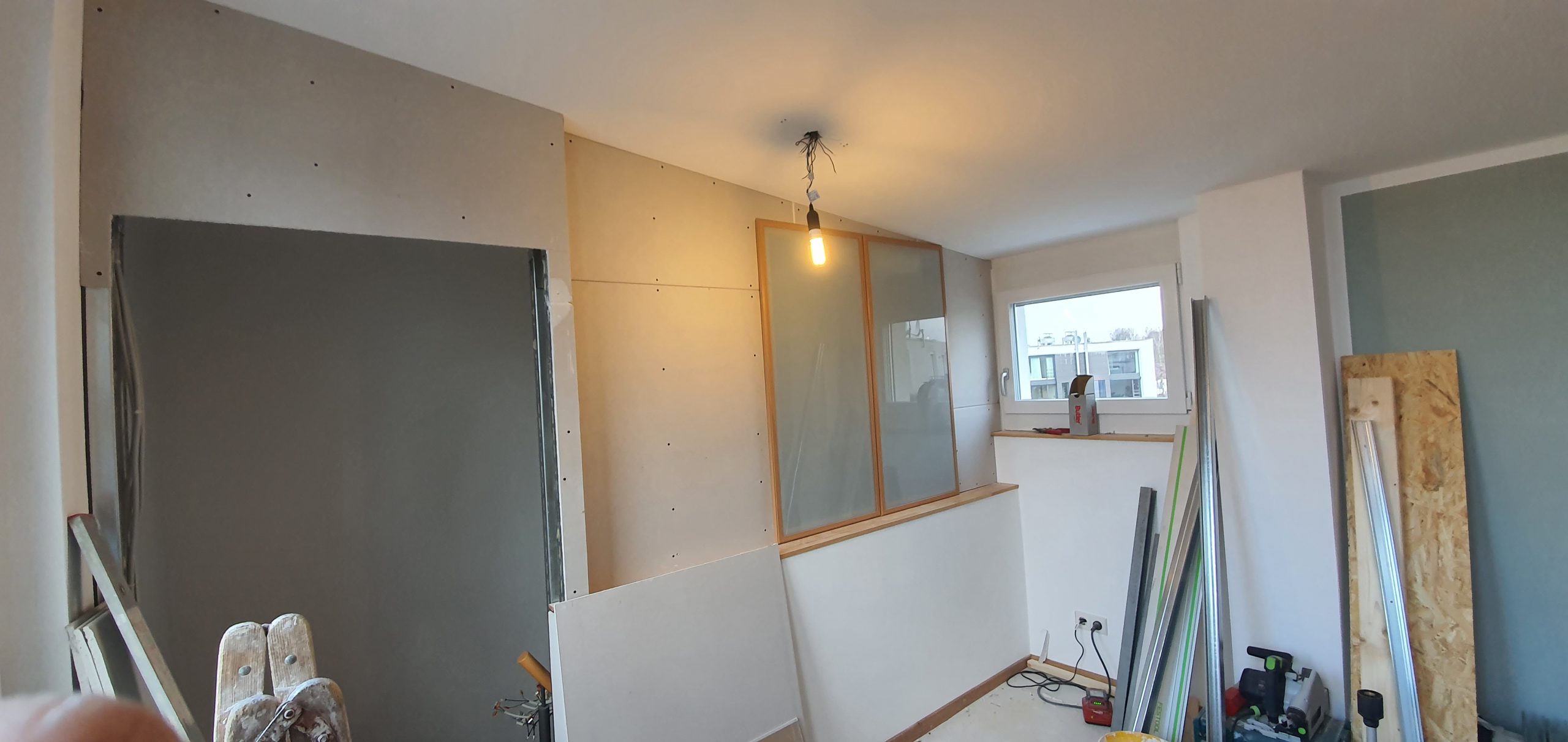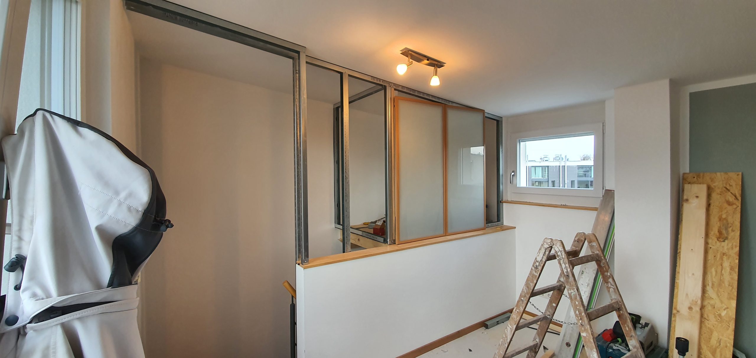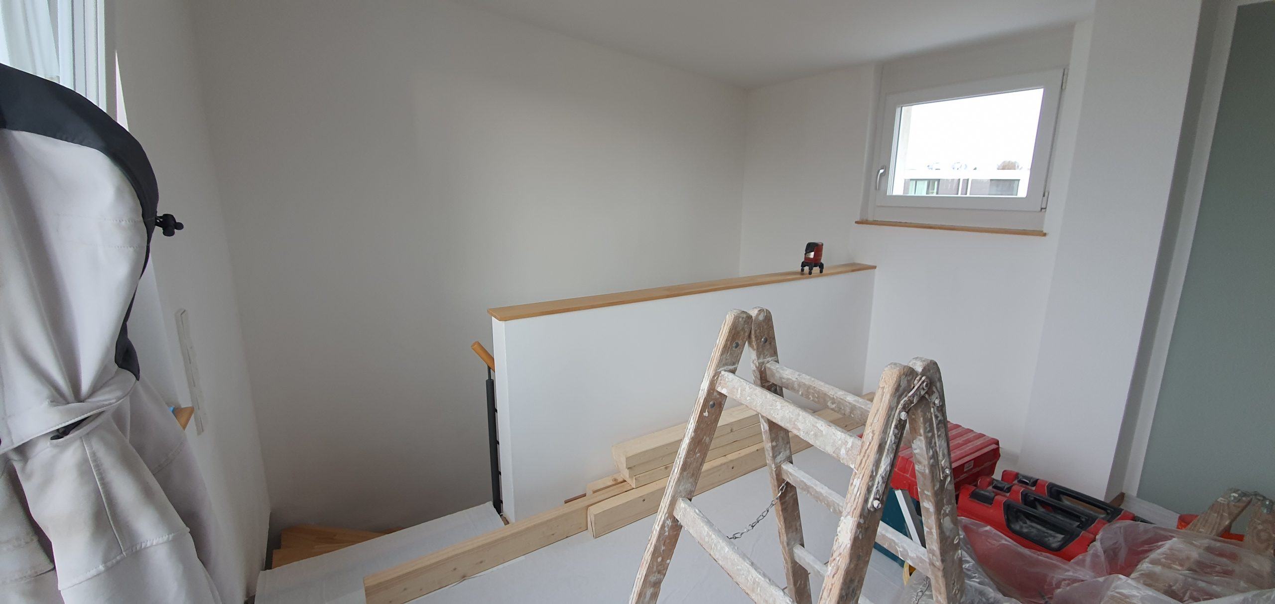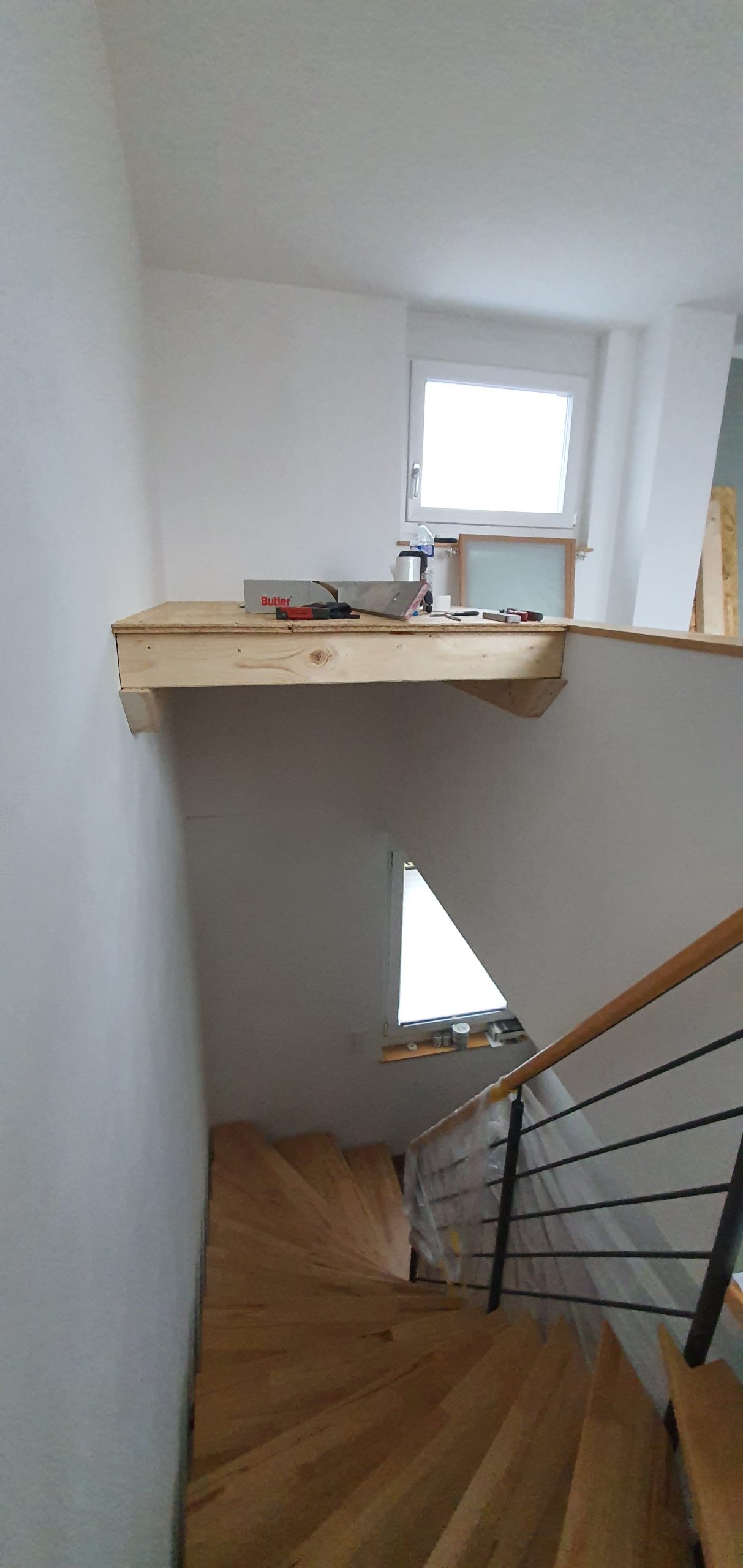 Im oberen Bereich des Treppenauges wurde zwischen Außenwand und Brüstung im Dachgeschoss eine Stauraumlösung in Holzbalkenkonstruktion hergestellt. Die Konstruktion wurde anschließend vollständig in Trockenbauweise verkleidet.