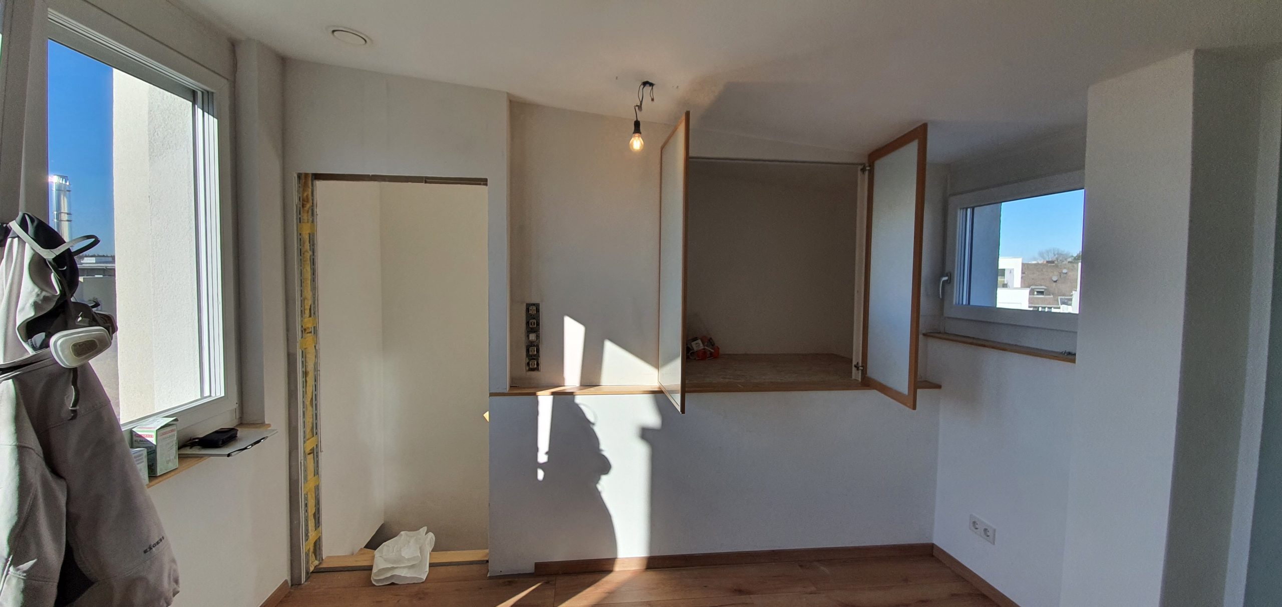 Für den Stauraum wurden bestehende Schranktüren wiederverwendet und als Schrankfronten integriert, wodurch eine funktionale und zugleich charaktervolle Lösung entstand.